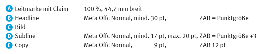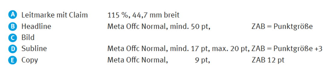 Die farbige Leitmarke mit Claim oder mit Absenderfahne ist bei allen Anzeigen am oberen rechten Formatrand platziert. Die Headline steht immer in der Schrift Meta Offc Normal. Sie wird als Überschrift über das Bild gestellt.