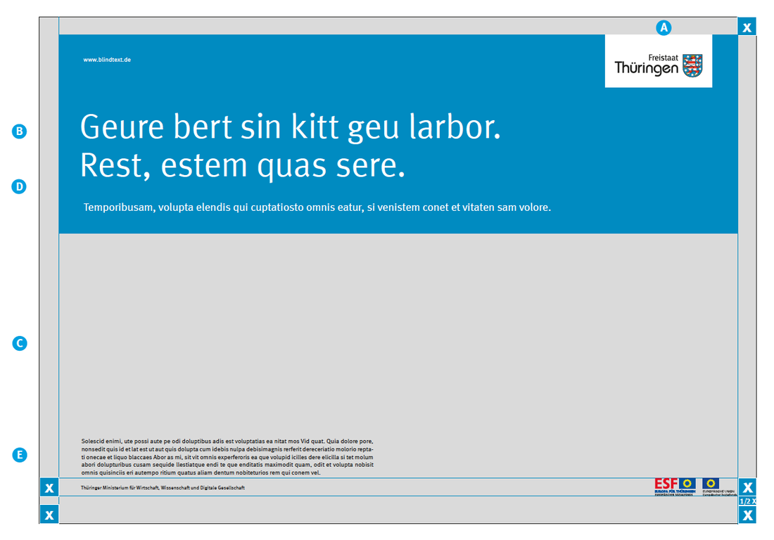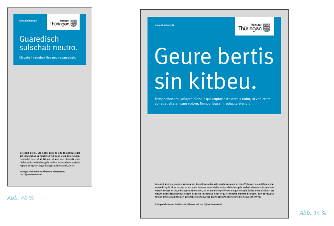 Das Anzeigenlayout entspricht dem Erscheinungsbild der kommunikativen Maßnahmen des Freistaats Thüringen. Es besteht die Möglichkeit, hoch- sowie querformatige Anzeigen zu gestalten.