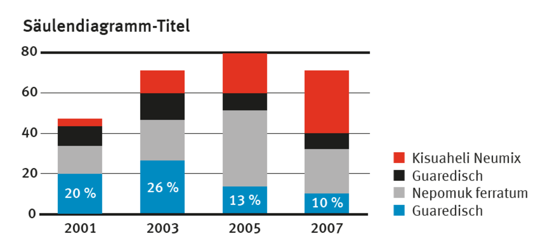 Säulendiagramme werden rein flächig, also ohne Konturlinien, angelegt. Farbverläufe und plastisch wirkende Darstellungen sind nicht erlaubt, da sie der Klarheit des Corporate Designs des Freistaats Thüringen entgegenwirken. Bei der Gestaltung von Säulendiagrammen können zur leichteren Unterscheidung mehrere Farbabstufungen zum Einsatz kommen. Die unterschiedlichen Farben für die Diagrammsäulen können den Kapiteln Grundlagen 1.10.1 und 1.10.3 entnommen werden.