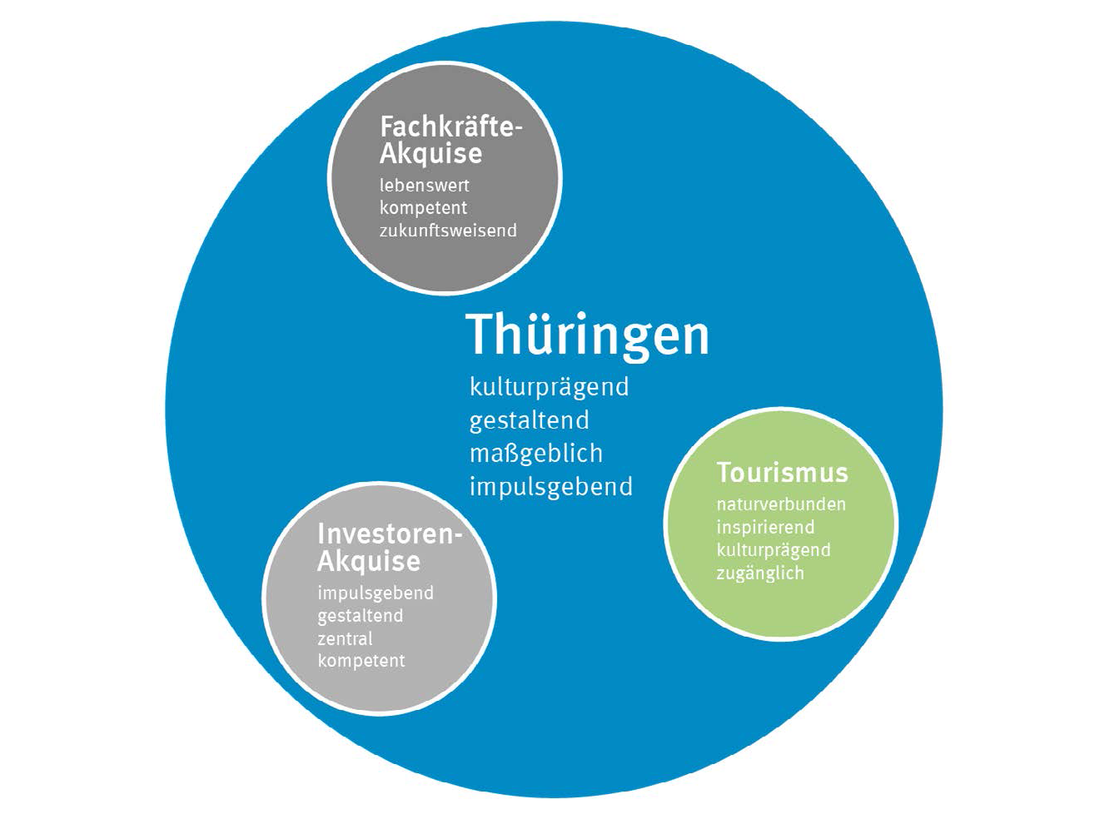 Thüringen wird als Land mit hoher Lebensqualität, mit Chancen und Möglichkeiten für Arbeitnehmer_innen, Studierende, Forscher_innen, Investoren_ innen, Gründer_innen einschließlich deren Familien und besonders ihren Kindern beworben. Mit seiner einzigartigen Verbindung von Kultur und Natur, den sich bietenden Chancen auf dem Arbeitsmarkt, seiner familienfreundlichen Struktur und seiner tiefen Verwurzelung in der deutschen Kultur- und Sozialgeschichte bietet Thüringen ein hoch attraktives Lebens- und Arbeitsumfeld. Gleichzeitig kann sich Thüringen damit im Wettbewerb der Bundesländer klar abgrenzen und für sich den Anspruch formulieren, modern und zukunftsorientiert zu sein. Diese Eigenschaften sind entscheidende Teile des Selbstverständnisses Thüringens.