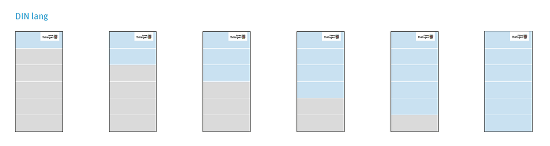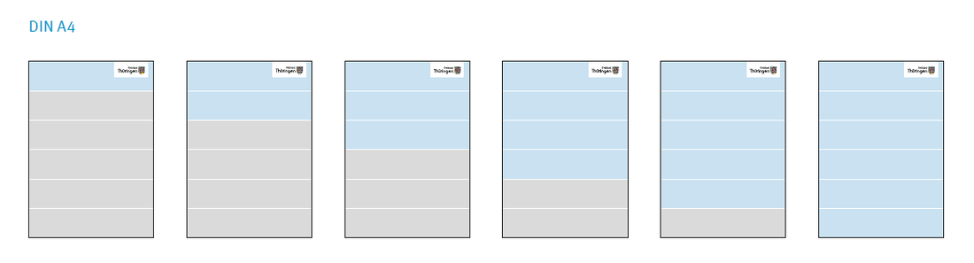 Ein prägnater Bestandteil der Gestaltung ist die Arbeit mit blauen Farbflächen. Zur leichteren Handhabung gibt es eine horizontale Sechstel-Teilung. Die Aufteilung dient der optimalen Ver-wendung des Blauanteils. Durch die variable Sechstel-Teilung ist dieses Raster für alle Publikationen und Formate anwendbar.