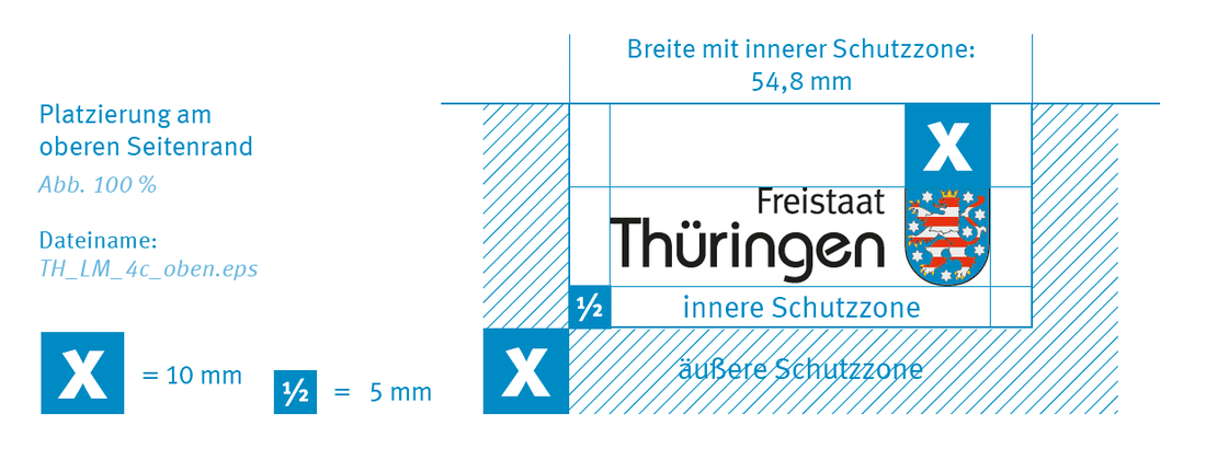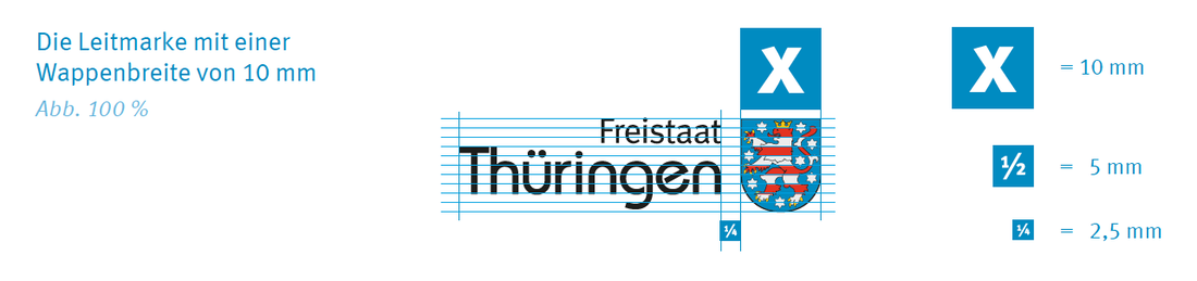 Ausnahmen werden in den jeweiligen Kapiteln bzw. sind in der Verwaltungsvorschrift zum Markenhandbuch geregelt. Die Leitmarke ist ein feststehendes Bild, dessen Gestaltung und Proportionen genau definiert sind. Die Leitmarke ist die hoheitliche Marke der Thüringer Landesverwaltung und darf nicht verändert werden. Eine Anwendung anderer Logos, Marken, Wappen und Signets für Einrichtungen oder Aktionen ist nicht gestattet, es sei denn, es handelt sich um Zweitlogos. Die genaue Anwendung der Leitmarke ist auf den folgenden Seiten definiert. Die Leitmarke ist immer dominant zu setzen. Submarken dürfen diese nicht überstrahlen.
